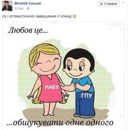 Экс-замгенпрокурора опубликовал карикатуру по мотиву вкладышей про любовь из жевательной резинки Love is..., на которой в роли девочки выступило НАБУ, а в роли мальчика, - ГПУ, возглавляемая Генпрокурором Юрием Луценко.