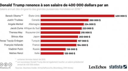 Согласно исследованию, которое провели во Франции, самая высокая зарплата у бывшего президента США Барака Обамы. На втором месте - премьер-министр Канады Джастин Трюдо, а третью строчку занимает канцлер Германии Ангела Меркель. Российский лидер занял в этом рейтинге девятое место.