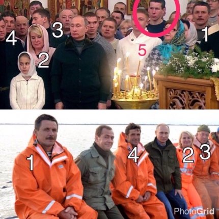 Так, в социальных сетях обратили внимание, что "рыбаки" с групповых снимков Путина и Медведева на острове Липно в Нижегородской области, оказались рядом с президентом России и на рождественских фотографиях из в храме Юрьева монастыря.