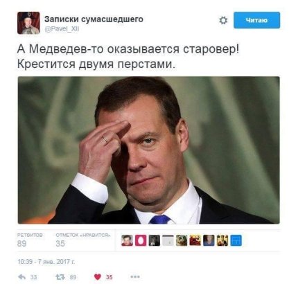 Соцсети рассмешило, что глава российского правительства крестился указательным и средним пальцами. "А Медведев-то оказывается старовер! Крестится двумя перстами", - прокомментировал фото пользователь Записки Сумасшедшего.