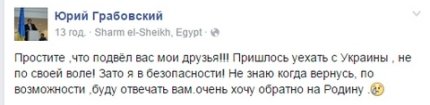 "Вибачте, що підвів вас, мої друзі!!! Довелося виїхати з України, не зі своєї волі! Зате я в безпеці! Не знаю, коли повернуся, по можливості буду відповідати вам. Дуже хочу назад на Батьківщину", - написав він.