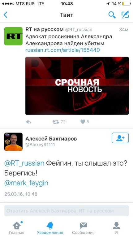"Кашин вчора написав про моє вбивство. Яка інформована людина-то!" - розповів адвокат.