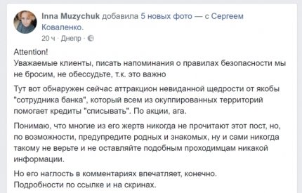 "Виявлено зараз атракціон небаченої щедрості від нібито "співробітника банку", який всім з окупованих територій допомагає кредити "списувати". За акції. За можливості, попередьте рідних і знайомих, ну і самі ніколи в таке не вірте і не залишайте подібним пройдисвітам ніякої інформації , але його нахабство в коментарях вражає, звичайно", - написала Музичук.