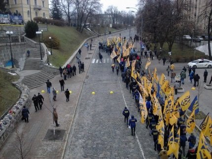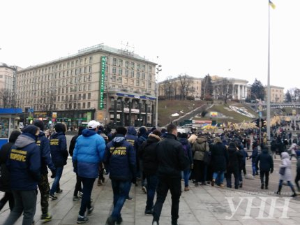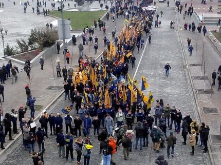 У центрі Києва колона молодих людей під прапорами Громадянського корпусу «Азов» з Майдану Незалежності попрямувала до Адміністрації президента на вулицю Банкову.