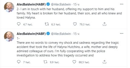 "У мене немає слів, щоб передати, який я шокований і засмучений трагічним нещасним випадком, який забрав життя Галини Гатчінс, дружини, матері й нашої колеги, якою ми глибоко захоплювалися. Я повною мірою співпрацюю з поліцією в розслідуванні, покликаному встановити, як сталася ця трагедія, і я підтримую зв'язок з її чоловіком, пропонуючи свою підтримку йому і його родині. Моє серце болить за її чоловіка, їхнього сина та усіх, хто знав і любив Галину", - написав Алек Болдуін.