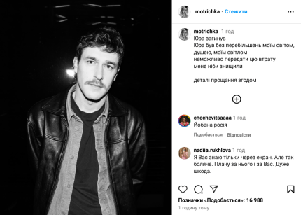Юра загинув. Юра був без перебільшень моїм світом, душею, моїм світлом. Неможливо передати цю втрату. Мене ніби знищили, — написала вона.