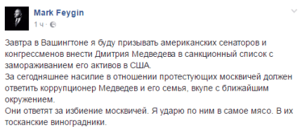 Російський адвокат Марк Фейгін пообіцяв закликати американських сенаторів ввести санкції проти прем'єр-міністра РФ Дмитра Медеведева і заморозити його активи на території США.