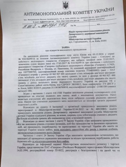 "Заяву про відкриття виконавчого провадження по стягненню штрафу і пені з ПАТ "Газпром" направлено до Департаменту державноі виконавчої служби Міністерства Юстиції", - написав він, додавши фото відповідних документів.