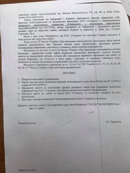 Відповідно до опублікованої заяви, Комітет просить відкрити виконавче провадження, вжити заходів щодо вирішення Господарського суду Києва від 5 грудня 2016 року про примусове стягнення з «Газпрому» штрафу в 85,9 млрд грн, накладеного в січні 2016 року, і пені в розмірі 85,9 млрд грн за несвоєчасну сплату штрафу.