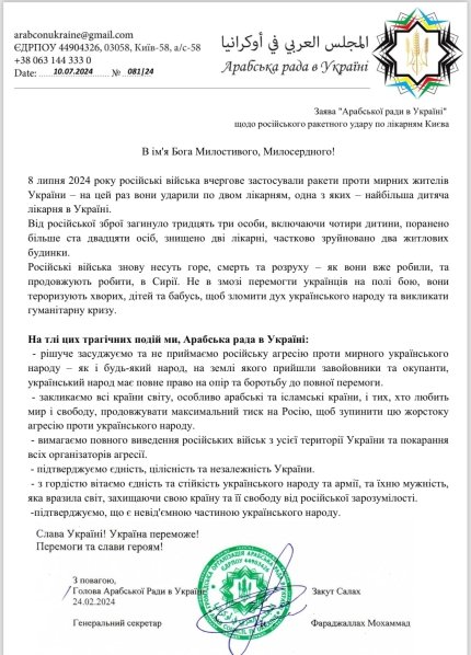 Відповідний документ опублікували на сторінці Арабської ради в Україні у Facebook.