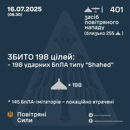 За попередніми даними станом на 08.30 протиповітряною обороною збито 198 ворожих БпЛА типу Shahed (безпілотників інших типів) на півночі, півдні, сході та в центрі країни.
