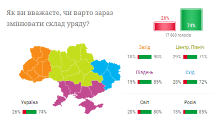 Згідно з результатами опитування, 74% українців вважають за необхідне перезапуск Кабінету міністрів. Як видно з опитування, найменше довіряють нинішньому уряду на заході і півдні країни (90% і 85% відповідно).