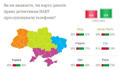 Редакція ONLINE.UA запитала в українців, чи вважають вони за необхідне надати право детективам НАБУ прослуховувати телефони. Згідно з отриманими результатами, більше половини українців (55%) не проти такої ініціативи. 45% жителів країни вважають, що це обмежуватиме права людини. Зокрема, 81% жителів східного регіону України згодні з президентом і виступили проти надання права НАБУ знімати інформацію з каналів зв'язку.