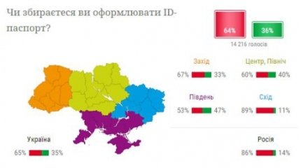 Незважаючи на всі позитивні властивості та можливості ID-паспорта, більшість українців (65%) поки не готові замінити старий паперовий документ на електронний. Такі результати опитування, яке провела редакція ONLINE.UA. Найменше бажання оформляти smart-паспорт висловили жителі східної України - 11%, позитивно до змін ставляться на півдні - 47%, в центрі та півночі країни - 40%.