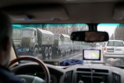 Відзначається, що колона військової техніки була помічена спочатку біля Дебальцевого Донецької області, - зафіксували щонайменше шість військових вантажівок, два БТР, зенітну установку, десятки авто без номерних знаків з більш 50 озброєних осіб всередині.