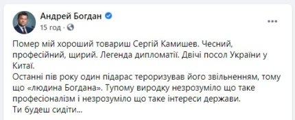 Новину про смерть дипломата також прокоментував колишній очільник Офісу президента України Андрій Богдан. Політик назвав ймовірну причину смерті Сергія Камишева. За його словами, вона могла настати через тиск. Як стверджує Богдан, дипломата неодноразово тероризували звільненням. Богдан заявив, що посол був його давнім хорошим другом, а також публічно пообіцяв, що помститься за смерть Камишева, зазначивши, що посадить винного. Що важливо розуміти, кого колишній глава ОП вважає винним у смерті посла — він так і не пояснив.