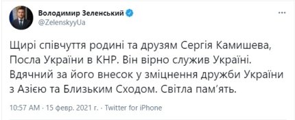 "Щирі співчуття сім'ї та друзям Сергія Камишева, посла України в КНР. Він вірно служив Україні. Вдячний за його внесок у зміцнення дружби України з Азією та Близьким Сходом. Світла пам’ять", - написав Володимир Зеленський у своєму мікроблозі 15 лютого.