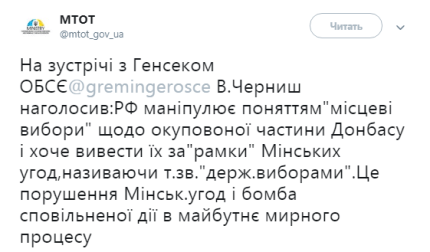 На зустрічі з Генсеком ОБСЄ Томас Гремінгером Черниш заявив, що Москва називає запланований фейковий процес по виборам нових ватажків "ЛНР" і "ДНР" державними виборами. Він підкреслив, що це суворе порушення Мінських угод, так як ці незаконні "вибори" стануть бомбою уповільненої дії, яка зірве мирний процес на Донбасі.