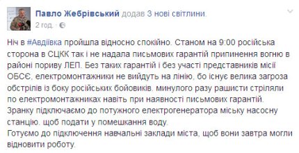 "Ніч в Авдіївці пройшла відносно спокійно. Станом на 9:00 російська сторона в СЦКК (Спільна комісія з координації та контролю - ред.) так і не надала письмових гарантій припинення вогню в районі пориву ЛЕП", - повідомив чиновник.