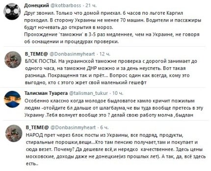 Очевидці чергового свавілля, влаштованого бойовиками, пишуть в соцмережах, що в пунктах пропуску "Олександрівка", "Оленівка" і "Горлівка", підконтрольних незаконним збройним формуванням "ДНР", а також на КПП Каргілл біля Донецька, розташованого напроти українського КПВВ Мар'їнка, скупчилися великі черги. Багато в цій черзі відстояли вже більше 12 годин, переночувавши на сильному морозі. Навіть прихильники "русского мира" проклинають терористів і пишуть, що українські КПВВ працюють в рази швидше КПП "ДНР".