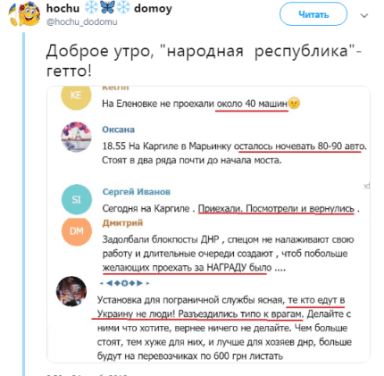 "О 5:20 по ДНР стали в чергу, були в першій двадцятці. О 12:00 за ДНР були вже 200-е. Їдуть одні проплачені, ціна питання 1500 р. До цього часу не пройшли. Повний капець", "Запустили о 17:10 на паспортний "ДНР". Простояли 12 годин з 5:20 ранку в чесній безкоштовній черзі. Були вранці в першій двадцятці. Висновки робіть самі", "Приїхали в 4 ранку. Були 32 по черзі "пільговій". Поїхали в 10 ранку, тобто повернулися додому (в машині вагітна 8 міс) просунулися за весь час на дві машини!!! Суперльгота пре! Всі дивляться і тупо в шоці!!! Скоро дійдемо до платної митниці, а не будешь платити - сиди вдома"," Не хамлять тільки тим, хто купив квиток, а інші - бидло! Мені не зрозуміло, чому я працюю і плачу податок, може я краще буду платити податок на Каргілл і вільно їхати! Чому Україну проїжджаєш за 15 хвилин, а Каргіл за 15 годин?", - пишуть обурені українці, які проживають на окупованому Донбасі.