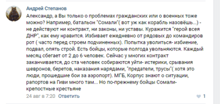 "Батальйон "Сомалі" (ось вже як корабель назвеш...) - не діють ні контракт, ні закони, ні статути. Куражиться "герой всієї ДНР", як йому подобається. Б'ють щодня від рядових до командирів рот (часто перед строєм підлеглих). Спроба звільнитися - побиття, підвал, знову в роту. Є бійці, які півроку звільняються. Щомісяця збігає від 2 до 6 осіб. Зараз у багатьох контракт закінчується, до ста чоловік збираються піти - істерики, зривання шевронів, беретів, покарання нарядами, "зрадники, труси" (хоча це люди, які пройшли бої за аеропорт). МГБ, Корпус знають про ситуацію, рапортів на Гіві багато там... Але як і раніше бійці Сомалі - кріпаки" - скаржаться в коментарях.