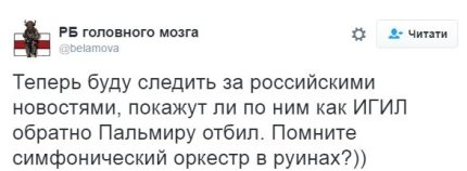 РБ головного мозку: "Тепер буду стежити за російськими новинами, чи покажуть по ним як ІДІЛ назад Пальміру відбив. Пам'ятайте симфонічний оркестр в руїнах?))"