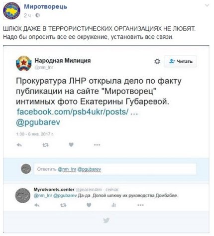 Бойовики так званої ЛНР заявили про намір порушити "кримінальну справу" проти волонтерів центру "Миротворець" через публікацію відвертих фото дружини одного з ватажків ДНР Павла Губарева.