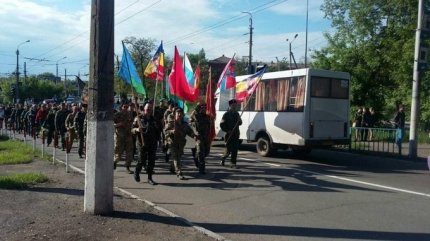 Український журналіст і блогер Денис Казанський заявив, що річницю перемоги у Другій Світовій війні в підконтрольному бойовикам ЛНР Алчевську зустріли під прапором нацистів.