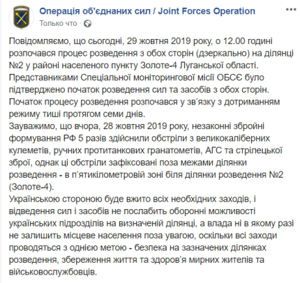 У вівторок, 29 жовтня, о 12:00 на Донбасі стартувало розведення сил і засобів Збройних Сил України та бойовиків так званої "ЛНР". Збройні формування окупантів сигналізували про готовність до відведення військ запуском сигнальних ракет. Про це повідомляє ONLINE.UA з посиланням на ресурси бойовиків.