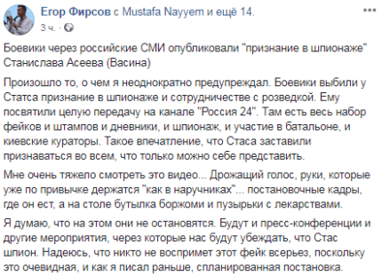 "Сталося те, про що я неодноразово попереджав. Бойовики вибили у Стаса визнання в шпигунстві і співпраці з розвідкою. Йому присвятили цілу передачу на каналі Росія 24. Там є весь набір фейків і штампів та щоденники, і шпигунство, і участь в батальйоні, і київські куратори. Таке враження, що Стаса змусили визнаватися в усьому, що тільки можна собі уявити. Сподіваюся, що ніхто не сприйме цей фейк всерйоз, оскільки це очевидна, і як я писав раніше, спланована постановка", - прокоментував ситуацію колишній народний депутат Єгор Фірсов.