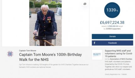 Літній військовослужбовець пообіцяв з 8 квітня пройти 100 кіл навколо свого будинку до власного сторіччя, яке виповниться наприкінці місяця. Це дорівнює приблизно 2,5 кілометра. Зібрані під час акції кошти спрямують до національної служби охорони здоров'я.
