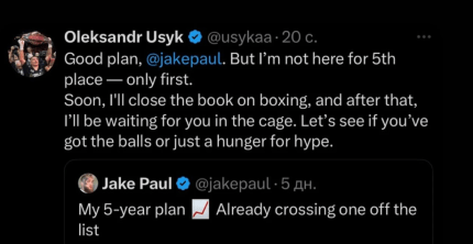 За словами американського блогера та боксера Джейка Пола (11-1, 7 КО), протягом п'яти найближчих років він серйозно налаштований вийти на бій з абсолютним чемпіоном світу в надважкій вазі Олександром Усиком (24-0, 15 КО). Українець уже озвучив своє рішення.