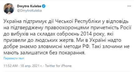 "Україна підтримує дії Чехії у відповідь на підтверджену правоохоронцями причетність Росії до вибухів на складах озброєнь 2014 року, які призвели до людських жертв. В Україні занадто добре знають зловмисні методи РФ", - написав Кулеба.