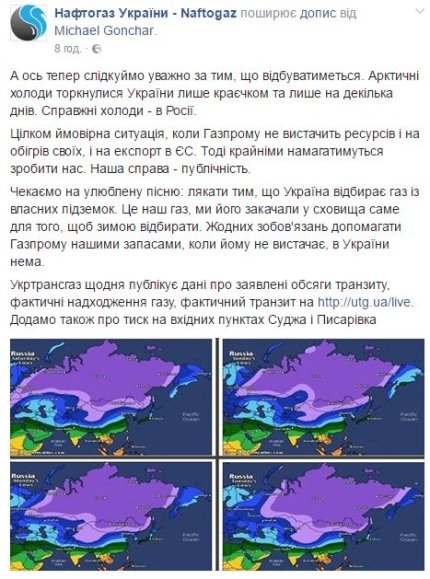 "Чекаємо улюблену пісню: лякати тим, що Україна відбирає газ зі своїх підземок. Це наш газ, ми його закачали в сховища саме для того, щоб взимку відбирати. Ніяких зобов'язань допомагати Газпрому нашими запасами, коли йому не вистачає, в України немає", - йдеться в повідомленні.