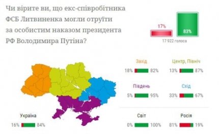 Більшість українців - 83% вірять у версію британського слідства. А ось громадяни РФ, навпаки, вважають малоймовірним причетність Путіна до вбивства Литвиненка - 81% респондентів довіряють своєму президенту і вважають його невинним.