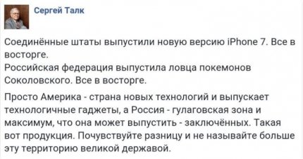 «Сполучені Штати випустили нову версію iPhone 7. Всі в захваті. Російська Федерація випустила ловця покемонів Соколовського. Все в захваті», - написав Талк.
