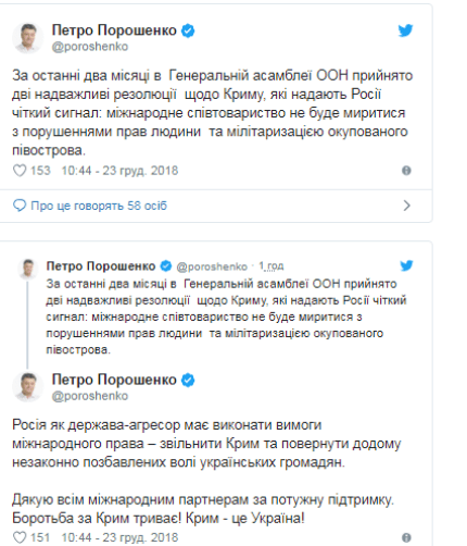 Порошенко нагадав, що за останні два місяці ГА ООН прийняла дві резолюціі по Криму, які український лідер вважає надважливими. На думку президента України, новий документ доводить те, що ніхто в світі не збирається закривати очі на все те, що відбувається з Кримом, і на беззаконня, яке там влаштувала Росія.