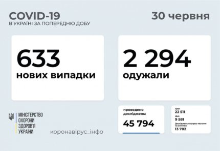 30 червня в Україні зафіксували 633 нових випадків зараження коронавірусів, госпіталізовано 360 пацієнтів, померли 40 осіб. За останню добу одужали 2294 українців.