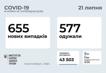 21 липня в Україні зафіксували 655 нових випадків зараження коронавірусом, госпіталізовано 508 пацієнтів, померли 13 осіб. За останню добу одужали 577 українців.