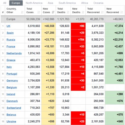 Кількість хворих на коронавірус в Європі 21 липня (фото - скріншот worldometers.info)