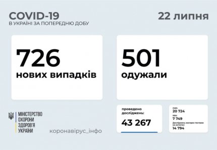 22 липня в Україні зафіксували 726 нових випадків зараження на коронавірус, госпіталізовано 402 пацієнтів, померла 21 людина. За останню добу одужали 501 українців.