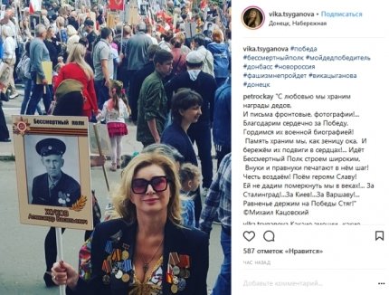 Слід зазначити, що Віка Циганова вже знаходиться в окупованому Донецьку. Вона опублікувала на своїй сторінці в соцмережі фото, на якому постала перед публікою в медалях і орденах. У такому вигляді співачка взяла участь у марші "Безсмертний полк", підписавши своє фото тегами "Новоросія" і "Донбас".