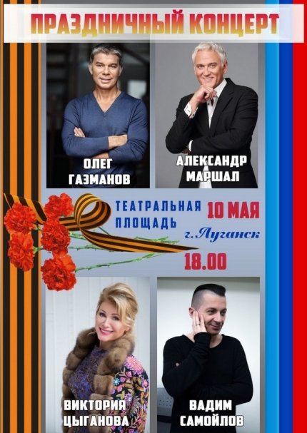 Зокрема, в Луганську виступлять Олег Газманов, Віка Циганова, Олександр Маршал і колишній фронтмен групи "Агата Крісті" Вадим Самойлов. Вони дадуть безкоштовний концерт на одній з площ міста.
