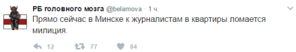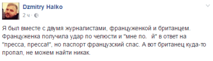 "Я був разом з двома журналістами, француженкою і британцем. Француженка отримала удар по щелепі і "мені по**й" у відповідь на "преса, преса!", але паспорт французький врятував. А ось британець кудись пропав, не можемо знайти ніяк", - розповів білоруський журналіст Dzmitry Halko у своєму Facebook.