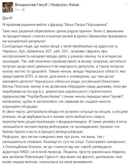 "Я прийняв рішення вийти з фракції "Блок Петра Порошенка". Таке моє рішення зумовлене низкою причин. Воно є зваженим і продиктовано станом існуючих речей в країні і бажанням працювати на конкретний результат", - написав Голуб.