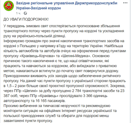 Відомо, що сьогодні, 22 грудня, в пункті пропуску "Смільниці" черга не рухається вже протягом 5 годин. Деякі ж чекають свою можливість виїхати в Польщу вже майже дві доби. Ще гірша ситуація на кордоні в пункті пропуску "Шегині", де автомобільна пробка досягає десяти кілометрів - там люди по три доби стоять у чергах.