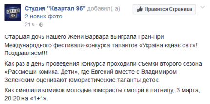 "Старша дочка нашого Жені Варвара виграла Гран-Прі Міжнародного фестивалю-конкурсу талантів «Україна єднає світ»! Вітаємо!!!", - сказано в повідомленні.