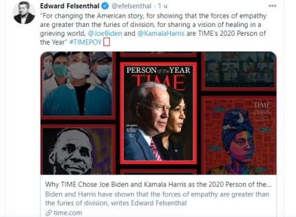 "За зміну американської історії, за демонстрацію того, що сили співчуття більше, ніж люті, за те, що вони поділяють бачення зцілення у світі, Джо Байден і Камала Гарріс стали "Людиною року" за версією Time у 2020 році", — прокоментував вибір своєї команди головний редактор Time Едвард Фельсенталь в соціальних мережах.
