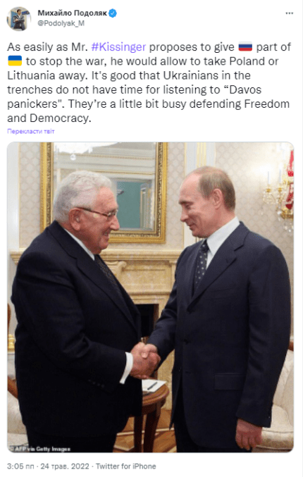 Доктор Кіссінджер сказав, що не можна дозволяти війні затягнутися надовго і закликав Захід змусити Україну погодитися на переговори на умовах, які дуже далекі від поточних військових цілей.